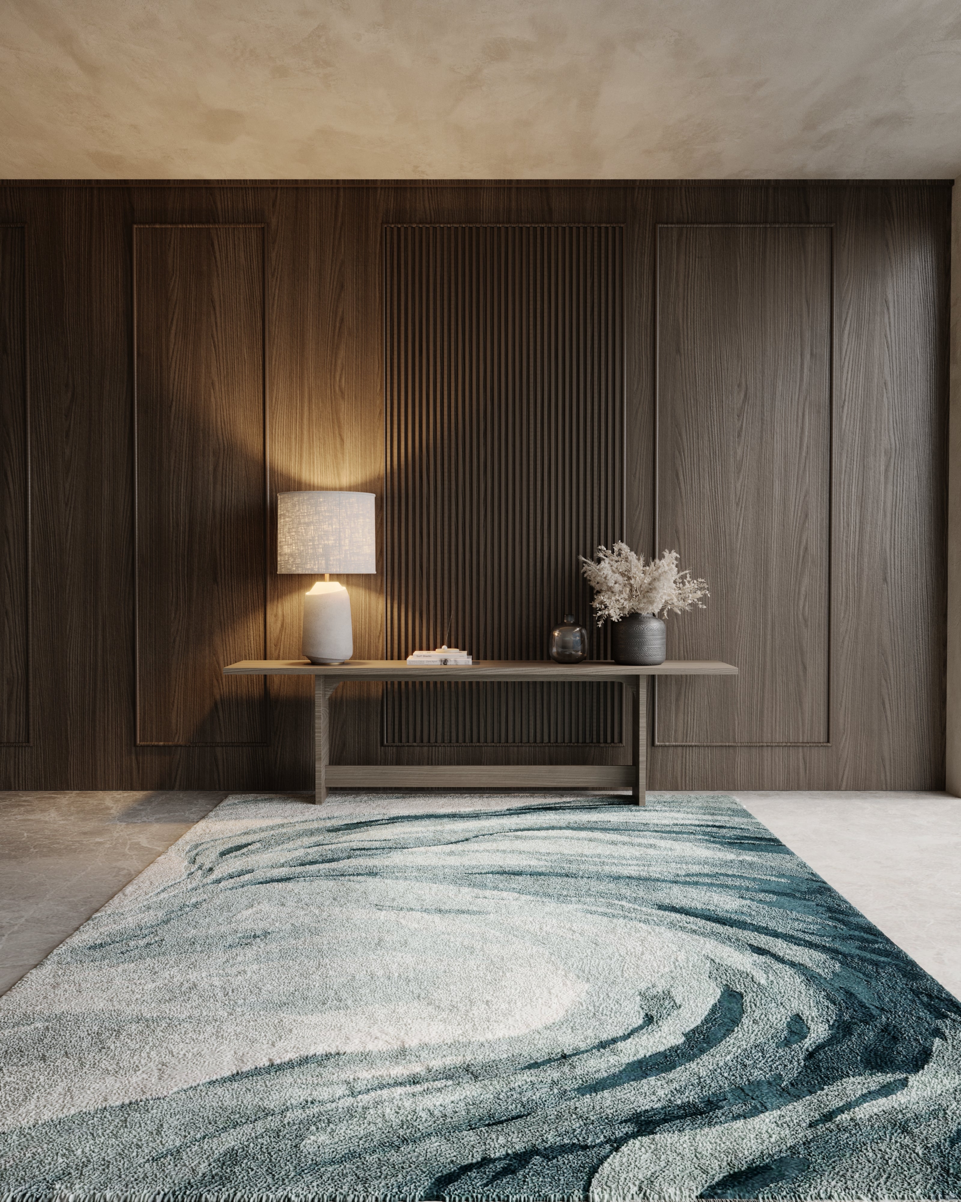 La collection Caresse se distingue par son mouvement fluide, ses textures superposées et une expression sensible de douceur. Des formes organiques et ondoyantes parcourent sa surface, créant un design à la fois immersif et subtilement théâtral. Évoquant des touches d’aquarelle sur une toile, sa composition révèle une palette harmonieuse de tons en dégradé qui se fondent délicatement les uns dans les autres.